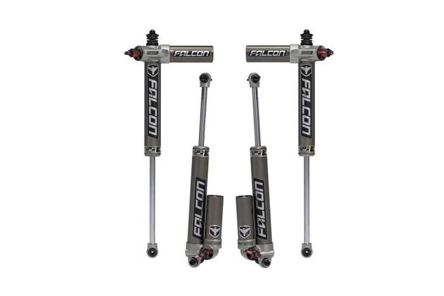 Falcon SP2 3.3 Fast Adjust Piggyback Shocks offer a wide range of adjustability with their easy to use 3-Position Fast Adjust Knob. Settings include Soft, Custom, and Firm. The Custom setting incorporates an 8-Position Micro Adjust Dial for more precise tuning between Soft and Firm. “High-Value Performance” is the driving force behind our vehicle-specific dampers for Jeeps, trucks, and SUVs. These Jeep-specific shock absorbers deliver increased stability, improved ride quality, and comfort for daily driven vehicles as well as race-inspired performance, handling, and stability for off-road rigs. Falcon Performance Shocks by TeraFlex. SP2 3.3 Fast Adjust: • SP2 3.3 Fast Adjust Piggyback Shocks offer a wide range of adjustability for specific terrain and/or handling characteristics • 3-Position Fast Adjust Knob for large damping adjustments • Settings: Soft, Custom, Firm • Custom setting includes an 8-Position Micro Adjust Dial for finer damping adjustments • Ideal for daily driven Jeeps as well as the serious enthusiast wanting to adjust damping for all driving conditions JK: • JK corner-specific shock absorber w/ race-inspired performance • Front upper offset stud design provides maximum shock body to frame clearance during articulation • Outboard mounting increases clearance for lifted vehicles w/ raised track bar brackets • Rear shock body (all) and reservoir (piggyback) positioned on bottom eliminates shaft damage from rocks kicked up by the tires • Rear Shock Skid Plates available separately Piggyback: • Piggyback design increases oil and gas capacity for reduced heat • Moving gas charge to piggyback reservoir allows maximum amount of travel • Flows 6x more oil than restrictive reservoir hose designs • Eliminates common leakage issues found in banjo and swivel fittings • Front shock’s unique horizontal piggyback reservoir increases tire clearance • Cartridge Upgrade Kits are available separately — contact customer service for details
