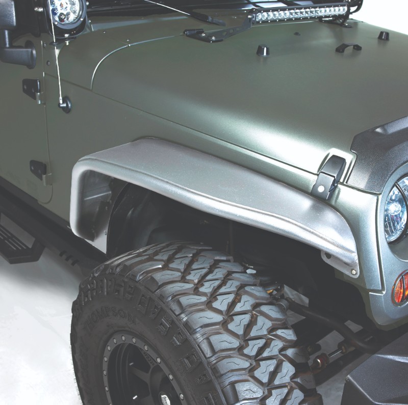 Bushwacker Aluminum JK Tube Flares are now available unfinished; ready for paint or a powder-coated finish. The flare design provides the strength and durability of steel, but without the weight. These aluminum fender flares increased tire clearance and protect your Jeep from road debris. LED side marker lights are mounted in a recessed location to protect from trail dangers.