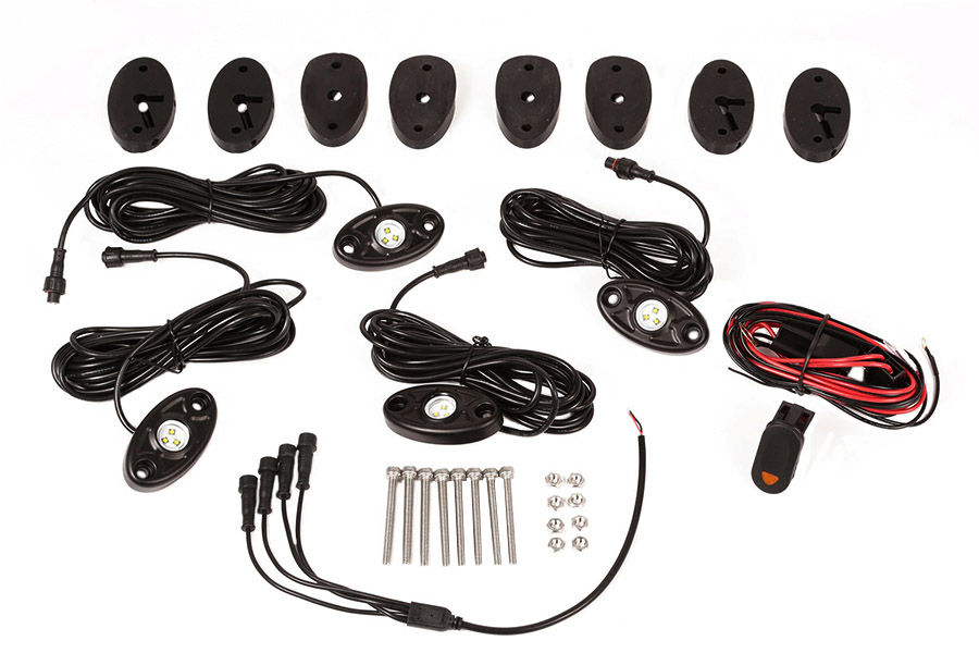 Rugged Ridge LED Rock Lights is a complete package to equip your Jeep or off-road vehicle so that you can see and be seen when piloting the trails after dark. Designed with the off-roader in mind, the LED Rock Lights utilize waterproof aluminum LED housings for safe and reliable performance in all weather conditions. Each of the four white LED Rock Light circuits is fitted with weather-resistant connectors and combines using a sealed splitter for a clean installation and efficient operation. The kit includes four flat mounts and 4 curved mounts, allowing you to mount the LED’s in a variety of locations depending on your application for greater versatility. Includes hardware, switch, relay, wiring and instructions.