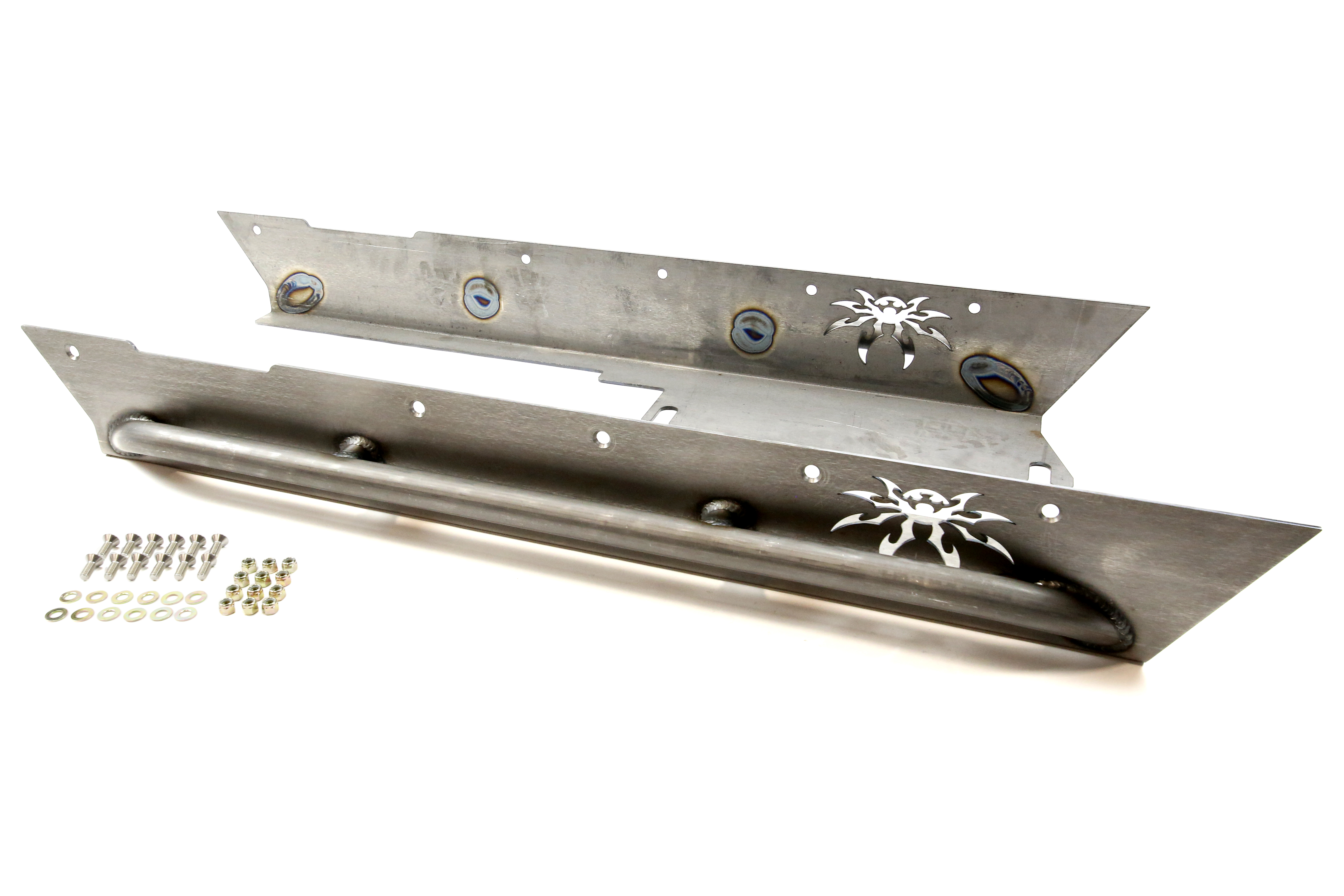 Machined from a 3/16" high strength steel, using a Laser Cut, and Brake-Formed for that precision, perfect fit. Countersunk bolt holes in the steel plates, allow them to fasten flush against the steel, which enables the Rockers to glide over obstructing objects. Everything needed for proper installation is included: detailed instructions and all the parts necessary for attaching the Rocker Knockers to the Rocker Panels. Because they bolt directly onto the Jeep's body at specific points, there is no risk of misalignment when other components are installed, such as a body lift.