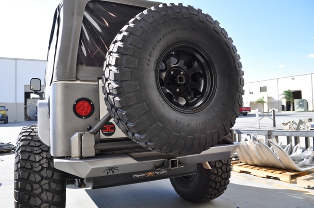 One of the main features of this rear bumper is the integrated rear tire carrier. The main structure of this tire carrier has been fabricated from NC- bent DOM tubing and laser-cut precision brake formed steel. The hinge on this tire carrier is super heavy-duty and features a CNC machined spindle and housing along with a pair of Timken bearings for a smooth operation while handling heavy loads. And to keep the tire carrier from wildly swinging about, Poison Spyder designed a spring-loaded pin lock with a stainless steel sliding plate that keeps the tire carrier locked into the opening position. This tire carrier will hold up to a 40" tire. and can be adjusted to host the tire in a low position to promote a better center of gravity. Included will be a license plate frame holder to be mounted in the center of the tire holder.