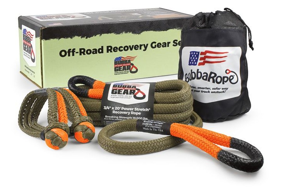 Includes Bubba Rope’s Renegade 3/4" diameter Power Stretch® Recovery Rope and matching NexGen Gator-Jaw® synthetic soft shackles. The Power Stretch Rope with vinyl armor Gator-ized coatings comes in 20’ or 30’ lengths. The set also includes a heavy-duty mesh duffle gear bag for easy carrying and storing. With a certified a breaking strength of 19,000 lbs., this gear set is specifically designed for dynamic off-road recoveries of Jeeps and/or vehicles weighing 4,000 – 5,000 lbs. Copied but never duplicated, Bubba’s Off-Road Recovery Gear is 100% made in the USA with unmatched quality. Everything you need for a faster, smarter, safer way to get your truck unstuck.