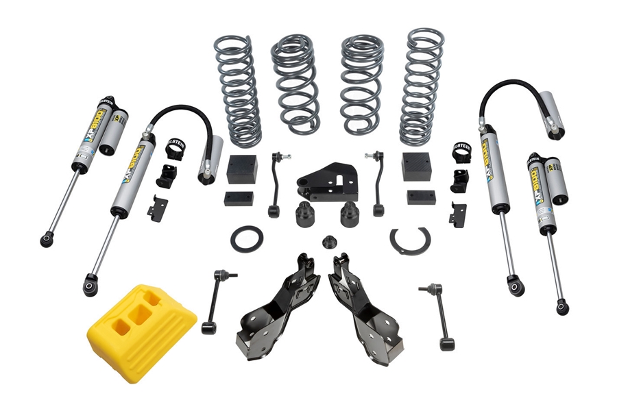 The frontend geometry is improved with a pair of AEV’s heavy duty, stamped control arm geometry correction brackets are included for an improved ride quality and reduced nosedive under hard braking. A rear track bar tower extension is included to correct the rear roll center while also generating a better turn-in response. Extended length front and rear sway bar end links compensate for the additional lift height, while new front and rear bump stop spacers improve bumper/axle contact under full articulation and jounce. Due to this suspension system’s lower lift height, there is no need to swap out any of the OE track bars, control arms or steering components.