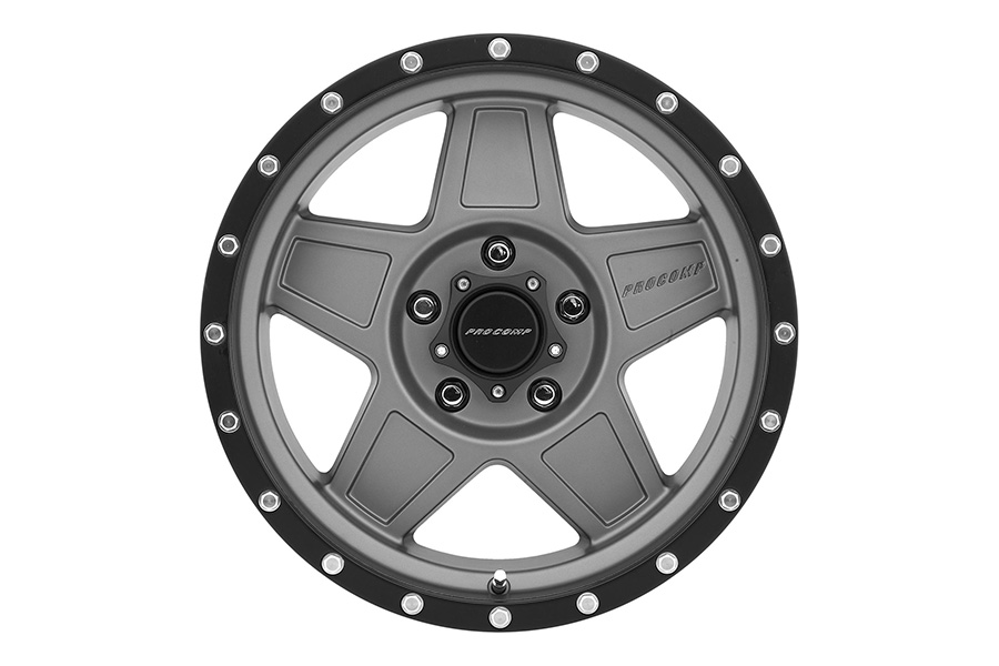 One-piece wheels have come a long way. Pro Comp Predator 35 Series two tone matte gray wheels feature machined -- simulated beadlock bolt heads, 5 spokes with recessed center sections, and branded center caps. Their protective powdercoat 2-tone finish consists of matte black imitation beadlock rings and matte gray rims. For killer looks buy Pro Comp Predator 35 Series two tone matte gray wheels.