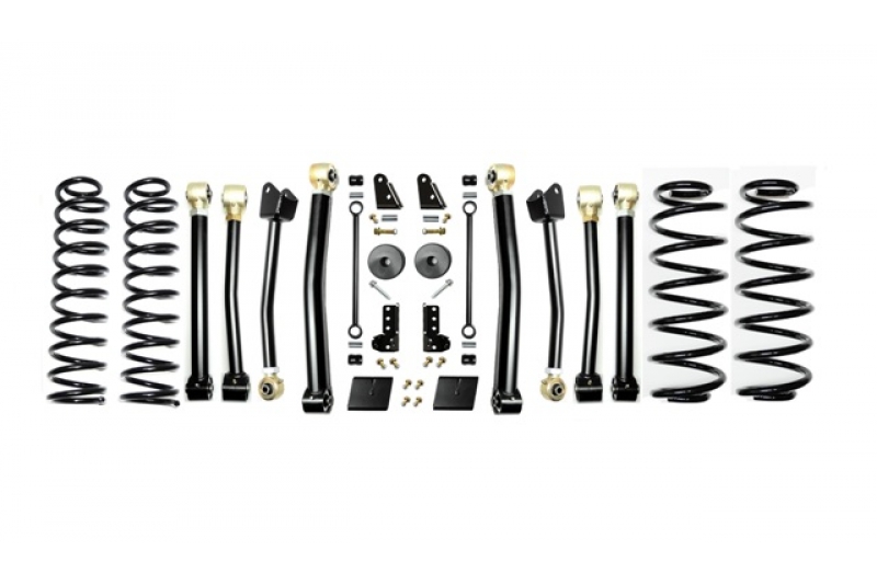 The EVO MFG 2.5″ JL Enforcer Kits are easy to install using normal tools. No drilling or cutting (optional rear shock extensions require one minor drill). They require no driveshaft or exhaust modifications (your shock choice may require this, contact manufacturer to be sure). Simple Bolt on installation.