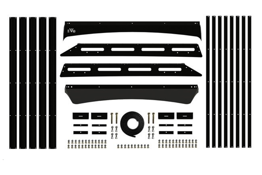 The EVO MFG JL Unlimited Trail Roof Rack is a versitile, no drilling or cutting, easy to install roof rack. Slim low profile design, tight roof connections and sloping faces all contribute to the clean appearance and low wind noise. Simple drip rail mounting allows for installation by even the most novice installer. It requires no drilling or permenant modifications of the hardtop leaving no chance of water damage and sepage into the interior compartment. Full length side plates and metal core rubber isolation efficiently distribute all loads and create an isolated quiet and cushioned oppertation. Flat upper platform gives unlimited options for carrying capacity and 5 T Slot left to right stantions offer optimal locating of tie down positions. The EVO MFG JL Unlimited Trail Roof Rack is Laser Cut and CNC Press Brake formed from steel. Simple installation with standard tools and supplied hardware.