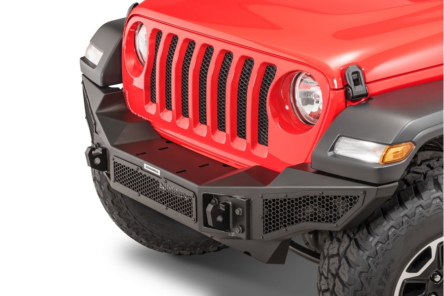 Rockline Winch Ready Front Full Width Bumper w/ signature hex mesh LED protective cover for use with an industry standard 20" double row LED bar or up to 4" standard cube LED's. Includes patented Rhino Hook D-Ring mounts