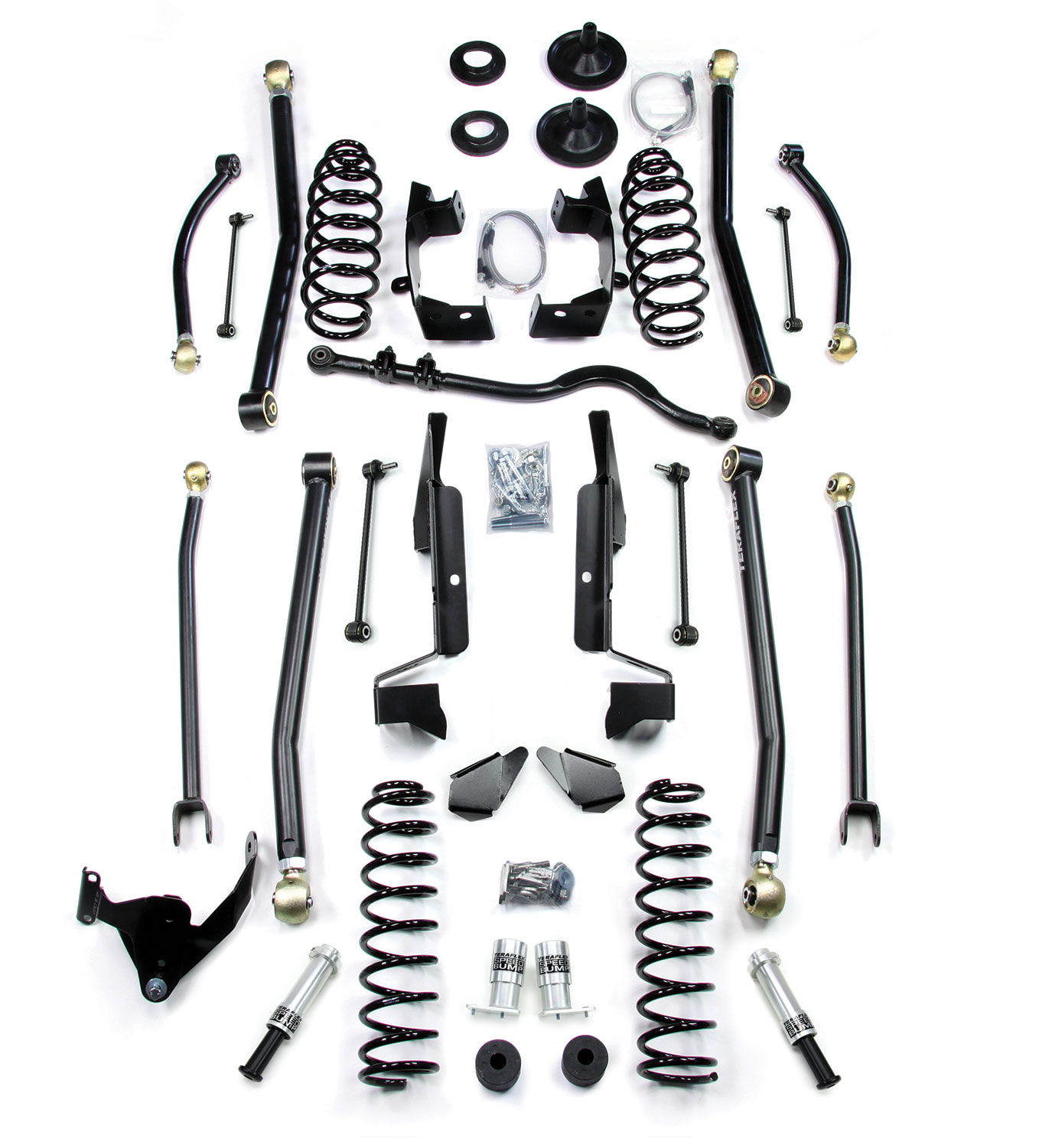 The advantage and benefit of the TeraFlex JK 4" Elite LCG Suspension System for JK Wranglers is apparent the minute you put the pedal to the floor. With superior handling, responsive steering, ultimate off-road performance, and customizable suspension geometry, this system is miles ahead of anything else out there. TeraFlex continues to dominate the off-road market, and the Elite LCG reinforces that position. The Elite LCG Suspension can handle anything you can dish out. The Elite LCG Suspension System is the perfect solution for aggressive trail users looking for the most advanced Long FlexArm system available, striking a perfect balance of low center of gravity and ground clearance, while providing enormous performance gains. The Elite LCG features adjustable suspension tuning, and is accomplished through fully adjustable upper and lower long FlexArms that allow pinion, caster, anti-squat, and tire position configurations to be modified. This kit includes 4" lift coil springs, front adjustable trackbar, weld-on long arm bracketry, long adjustable FlexArms, front adjustable monster trackbar, front swaybar disconnects, rear swaybar links, rear trackbar bracket, front & rear brake lines, SpeedBump bumpstops and all necessary hardware. This suspension system is designed to fit up to 37” tires (aftermarket wheels with 4.5” backspacing or less is required). Fits all JK Wrangler models including Rubicon & Unlimited. Note: Cutting & removal of factory bracketry and Welding is required for installation of this kit. Driveshaft modifications are recommended with this suspension system. 2012+ JKs require exhaust spacers (#2610000) or other exhaust modification for proper driveshaft clearance.