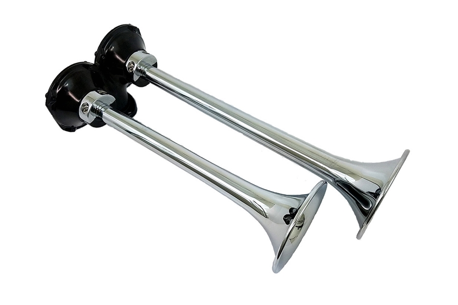 Get the sound of a Big-Rig on your truck with these roof-mount horns. These are the same kind of horns you’ll find on a Mack or a Peterbilt. The air inlets are on the underside to allow operation with manual valves and to avoid exposed air lines and wiring.