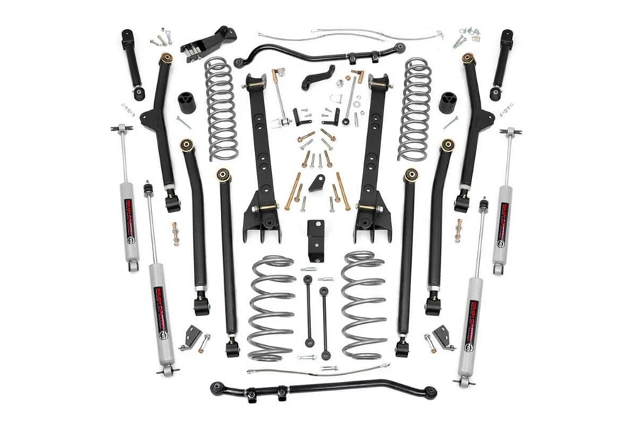 Gain the absolute best in off-road articulation and a host of impressive features with this all-inclusive package featuring upgraded Forged Adjustable Track Bars. There are no obstacles you can't tackle with Rough Country's ultra-durable 6-inch Long-Arm Lift Kit for Jeep TJ Unlimited. Featuring HUGE adjustable lower control arms and X-Flex Joints, this beefy Suspension setup with longer travel, high-clearance arms doesn't just prevent binding and rear-steer, it gives unparalleled axle flex while keeping pinion angles optimized - letting you negotiate trails on your terms. With OEM style Clevite Bushings, Sway Bar Disconnects, and our large diameter N3 Shocks, you've got a rig that's ready to go where most wouldn't dare.