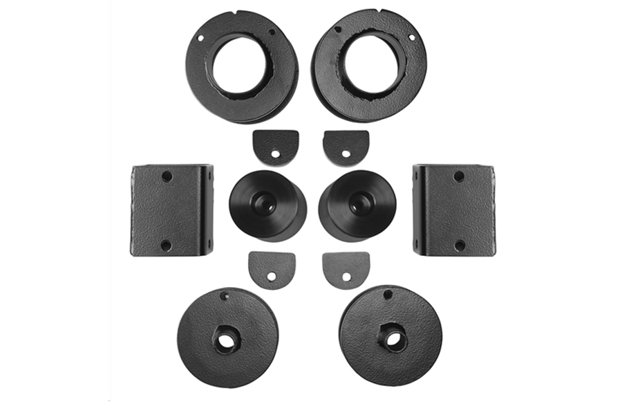 Steel coil spring spacers with index pins and holes to locate factory isolators for perfect spring alignment.