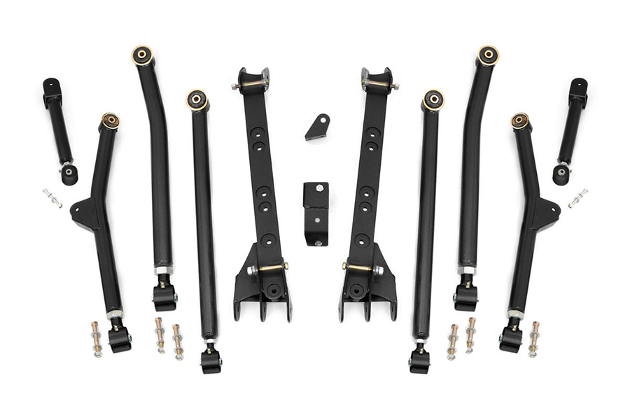 Transform your existing four or six inch kit with Rough Country’s Long Arm Upgrade for your 97-06 Jeep Wrangler. This kit features extreme travel long arms that assist in keeping optimum alignment and give optimum articulation. The X-flex control arms are fully greasable, and feature OEM style rubber bushings and have a massive 2.5" diameter body and 1.25" thread. The upper joints pivot up to 20 degrees, lower joints pivot up to 35 degrees.