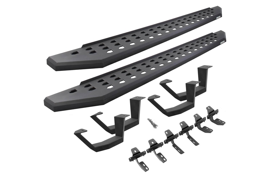 Go Rhino's legendary RB20 cab length running boards will make your truck, Jeep or SUV stand apart from the crowd. With an aggressive, yet stylish appearance, these bolt-on steps take their visual inspiration from the Ford Raptor but are made for more than just looks. The RB20's perforated holes, punched into the surface of the step, gives maximum traction and prevents mud, ice, and snow from accumulating.