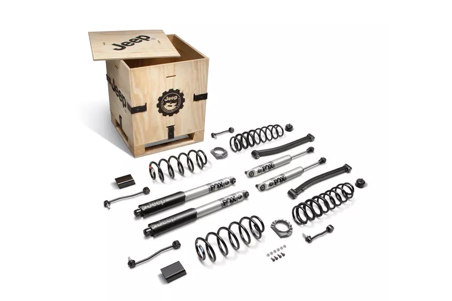 Jeep Performance Parts 2 Lift Kit has been developed by Jeep brand engineers and off-road enthusiasts and allows you to use larger tires. The kit includes 2.5" diameter aluminum body monotube FOX shock absorbers for cooler operation. The lift kit increases articulation and tire-to-ground contact and the longer front control arms optimize suspension tuning for on-road drivability while improving off-road capability. It works with electronic stability control although unique alignment specifications are required. The parts are easy to install as no driveshaft or brake line replacements are required. Rigorously tested for performance, durability, and corrosion, the parts in this kit meet all FCA US LLC production standards. The kit comes in a reusable Jeep branded wooden crate.