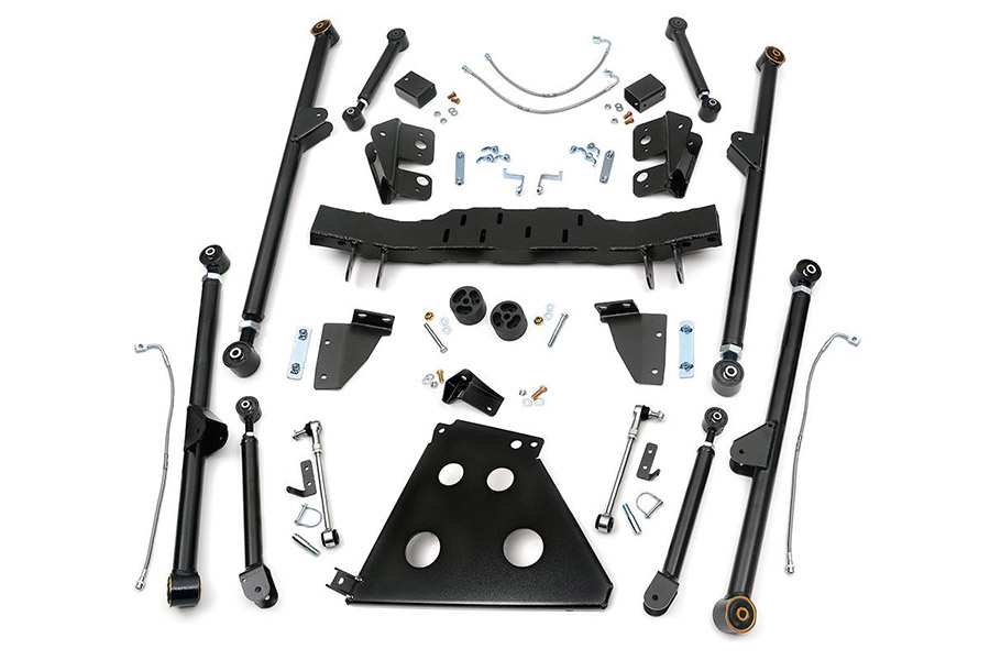 Gain the absolute best in off-road articulation and a host of impressive features with this all-inclusive package. There are no obstacles you can't tackle with our front and rear Y-link Suspension setup featuring HUGE adjustable 2" lower control arms and X-Flex Joints. This Dual Y-link Suspension setup with longer travel arms doesn't just prevent binding and rear-steer, it gives you unparalelled axle flex while keeping pinion angles optimized - letting you negotiate trails on your terms.