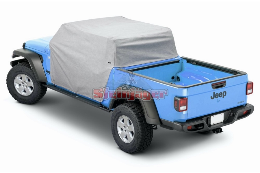 Lightweight yet weatherproof 5-layer car cover fabric. Each cover is custom designed to fit over your 2019-Current Jeep Gladiator when the soft top or hard top has been removed from the vehicle. Either durable cab cover designs hold the water out while providing breathable protection for your open cab vehicle. This is the perfect weatherproof solution when you are traveling with a Bimini Top, without a top or with a summer mesh top. The long side flaps fit over your door area to protect the interior of the vehicle if the doors are removed.