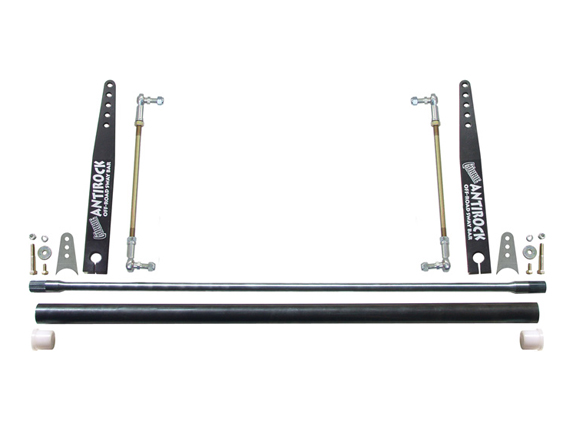 RockJock now offers Antirock® sway bar kits in a universal form for those building their own custom rigs and rock buggies. This universal kit features a 45" torsion bar length and 17" long steel arms. Vertical links use a 14" long 1/2" x .20 RH/LH threaded rod that can be cut down to your desired length, and the necessary 1/2" x 20 thread Heim joint rod ends, jam nuts and tabs to weld to your axle tube are supplied. Also supplied is the universal weld-in 1.75" x .095 wall DOM tube that is cut to the proper length to work with the torsion bar length, and the Delron bushings to support the bar in the tube. The 45" bar is a .800" diameter. These kits require fabricating for installation -- these are NOT bolt-on kits.