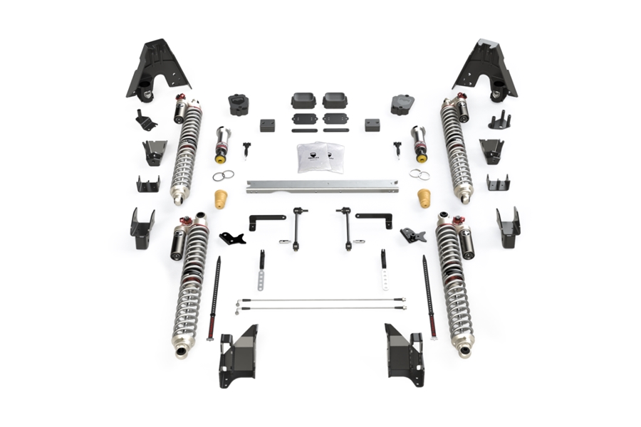 Includes: Coilovers, Coilover frame & axle brackets (front, rear), Crossmember, SpeedBump Bump Stop Kit (front, rear), front sway bar quick disconnects, sway bar links (rear), RockGuard Transmission Skid Plate, brake line anchors (front), all necessary hardware, and more.