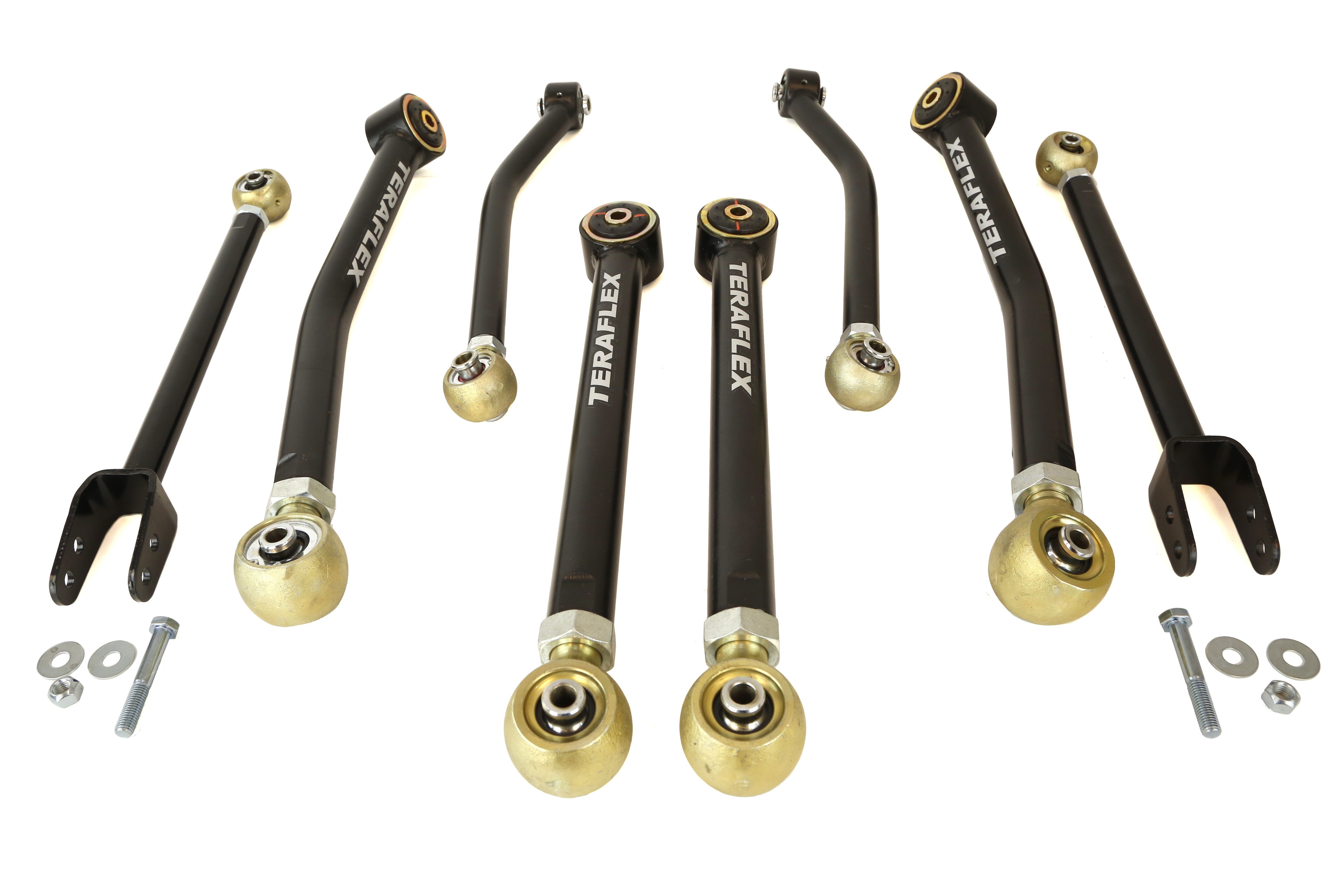 The TeraFlex FlexArm kit has been designed to be added with any existing suspension lift which will allow custom pinion and custom caster angles to be set for a proper alignment. These are also design to re-center the axle in the wheel for proper suspension movement, and to adjust the wheelbase length. Included in the kit are all 8 adjustable front and rear lower and upper FlexArms.