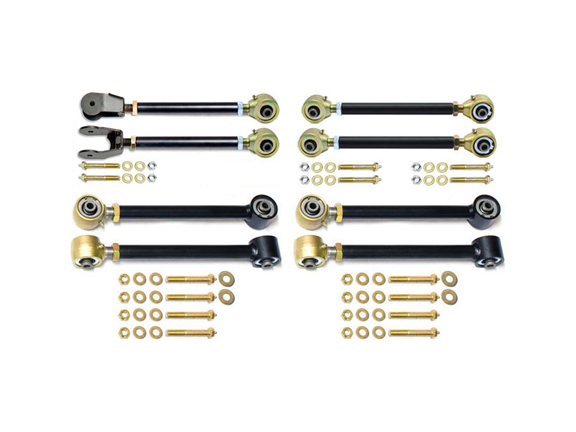 Description: For 1997-2006 Jeep TJ's and LJ's. This is the complete set of 8 Johnny Joint® Control Arms. All arms are fully adjustable allowing the pinion angles and caster angle to be adjusted. This adjustable feature allows your vehicle to be upgraded to different lift amounts without having to replace the control arms in the future. Unique to this kit is double adjustable front and rear upper arms for maximum adjustability. All arms are made from 1" x .156" wall D.O.M. tubing, are powder coated semi-gloss black, and come with zerk fitted grade 8 mounting bolts. To allow complete unrestricted movement, the Johnny Joint® is used at both ends of all 4 of the rear arms, both ends of the front lowers, and on one end of the front upper arms. Also see our CE-9102K Johnny Joint® housing kit for installing Johnny Joints® on the front end housing.