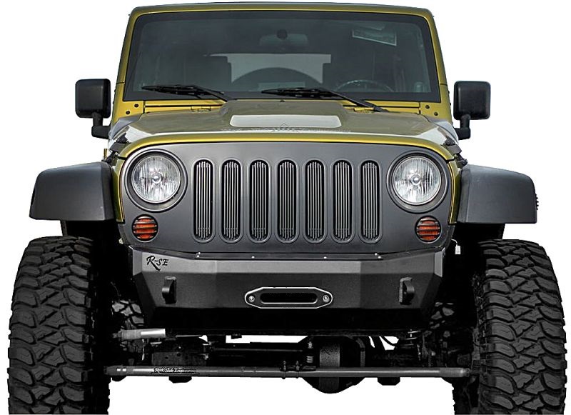 The Rock Slide Engineering Front bumper is built with 3/16" alloy steel and 1/4" mounting plates. Features include 2 recovery shackle points and a lowered winch mount plate to maximize airflow through the radiator. Other great features include a unique fabricated bull bar with optional winch Work Light Kit. This innovative design provides a unique and distinctive look that compliments the style lines of your Wrangler with serious off road durability. *Optional Skid Plate provides offroad protection to chassis and steering components. *Made in USA.