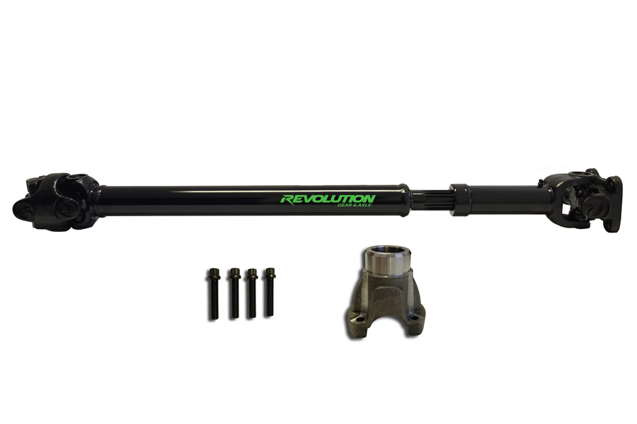 USA Made Premium Front JL 1310 CV Driveshaft by Revolution Gear and Axle. This flange style driveshaft fits 2 or 4 Door 2018 and Newer JL Rubicon models and will work with up to 37 Inch tires and a 6 Inch Lift.