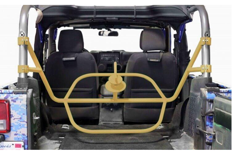 The Steinjäger internal tire carrier is designed to hold up to a 35" tire inside the cab of your Jeep while still leaving you storage room for tools and a cooler. It simply mounts to the factory roll bar with four clamps. Steinjäger has designed and manufactured a polyurethane centering device that will center the wheel and hold it securely while off-roading.