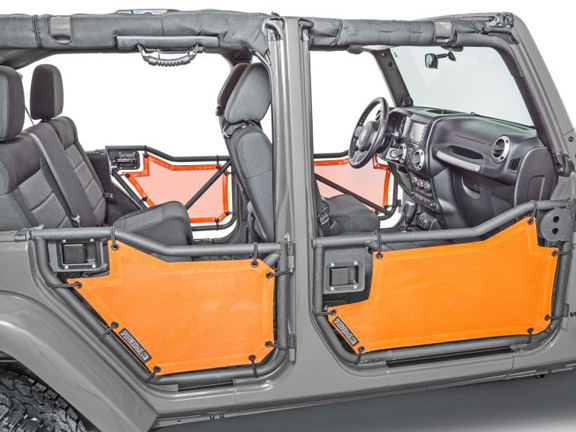 SpiderWebShade ShadeSkins are now available and specifically designed for Rancho® Rock Gear tube doors. ShadeSkins are made using the signature Heavy-Duty TrailMesh material designed to meet the needs of the most aggressive off road enthusiast. ShadeSkins help keep mud and branches out of the vehicle while still allowing air to flow through. ShadeSkins are available in 10 vibrant colors to help you continue customizing your Jeep. ShadeSkins are sold in pairs. ShadeSkins also feature a 5 YEAR WARRANTY and as with all of the SpiderWebShade products, all of the install hardware is included and there is no drilling or additional tools necessary.