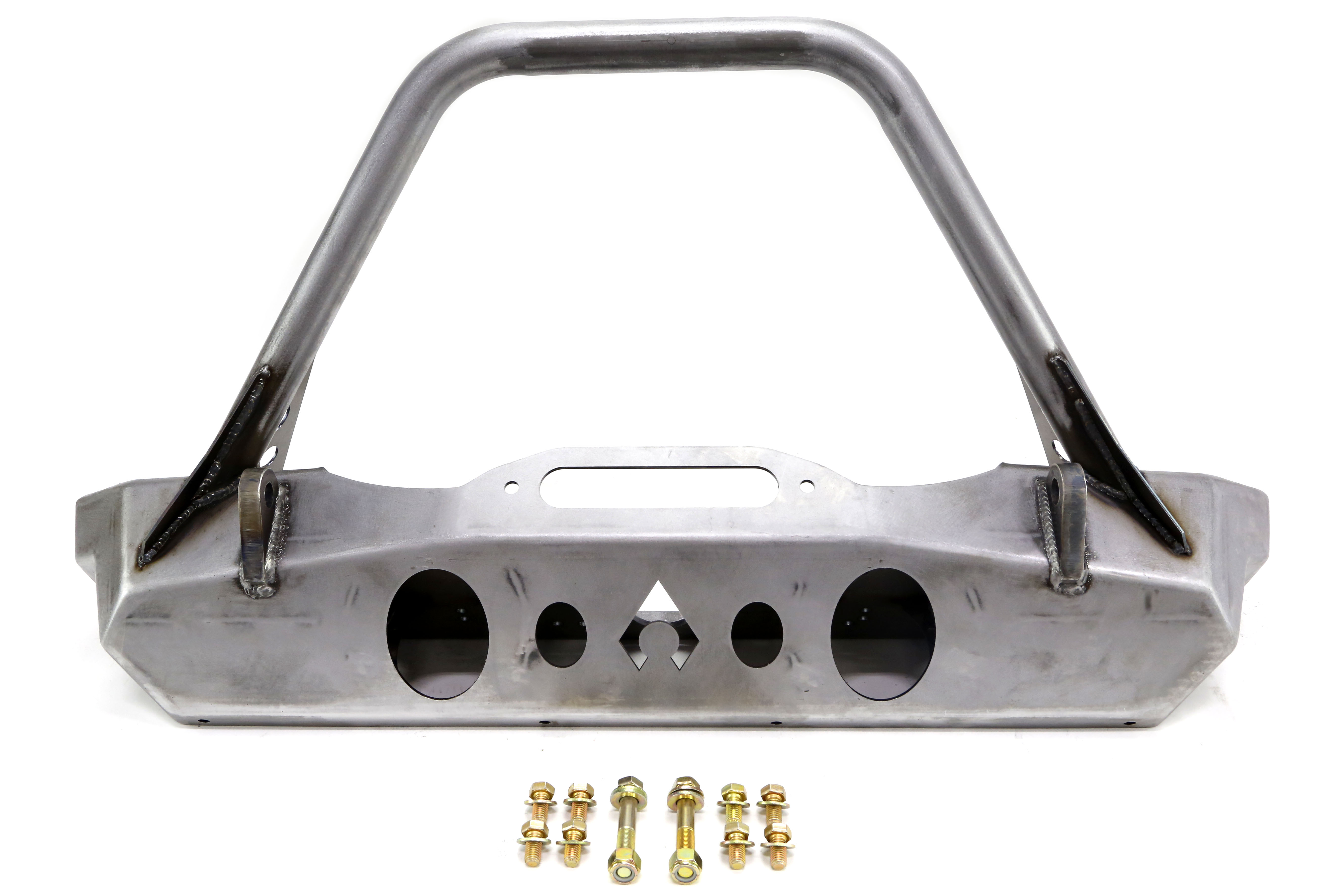 To help customize color coordination, the bumper set comes in bare steel. It is easy to install with ¾" alloy steel shackle mounts and a stinger that is formed with 1.75" DOM tubing. The stinger is also customizable with several designs available as well as a build your own option.