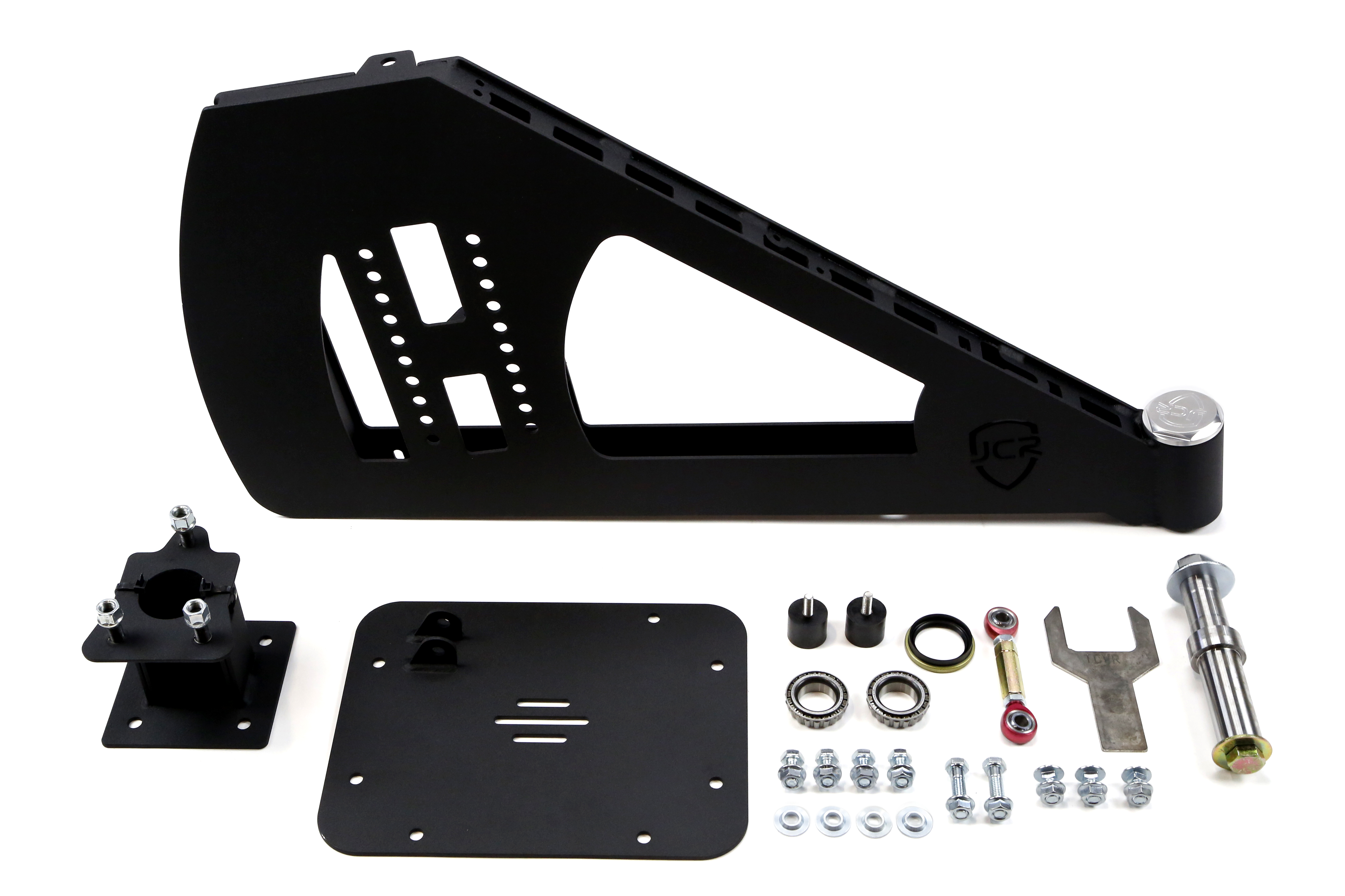 The shield carrier comes ready to bolt-on to your JCR Offroad Vanguard full-width or Crusader mid-width rear bumper. The tire mount is adjustable for different wheel back spacing and for various tire sizes. The Shield Carrier will work with up to a 38" size tire while the Hi-lift mount will accommodate 48" Black or Red Hi-lifts and most no-name farm jacks. LED third brake light is available too.