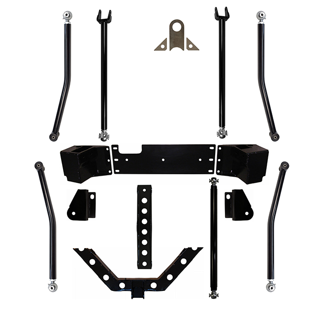 Additional features include full-length upper control arms that come with high clearance adjustable lower control arms fabricated from 2" Solid Alloy Steel. The lower control arms have 1" shank Monster Krawler joints at the axle connection. There will be a set of built-a-ball joints for the upper control arm pivots at the axle. The independent 3 link rear features the adjustable anti-squat feature. And included is a heavy duty passenger side axle mount fabricated from 1" thick alloy steel.