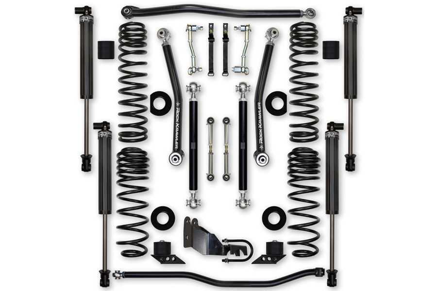 The Rock Krawler JL 3.5 Max Travel System was designed for those who want a complete bolt-in installation, increased articulation and the durability and off-road performance you expect from Rock Krawler Suspension. The X Factor Series adjustable lower control arms offer a total of 90 degrees of misalignment that eliminates the bind in your JL’s factory lowers, while high misalignment adjustable upper control arms let you precision tune your JL’s caster. Rock Krawler’s industry leading triple rate coils give you 3.5" of lift to clear up to 40" tires, depending on model, and improve the on-road ride over the factory linear rate springs. All Rock Krawler JL systems include correction pads that reduce the spring bow inherent in the factory set up. The provided track bar geometry corrections, both front and rear, lets you perfectly center the axles so there is no compromise in on road handling.