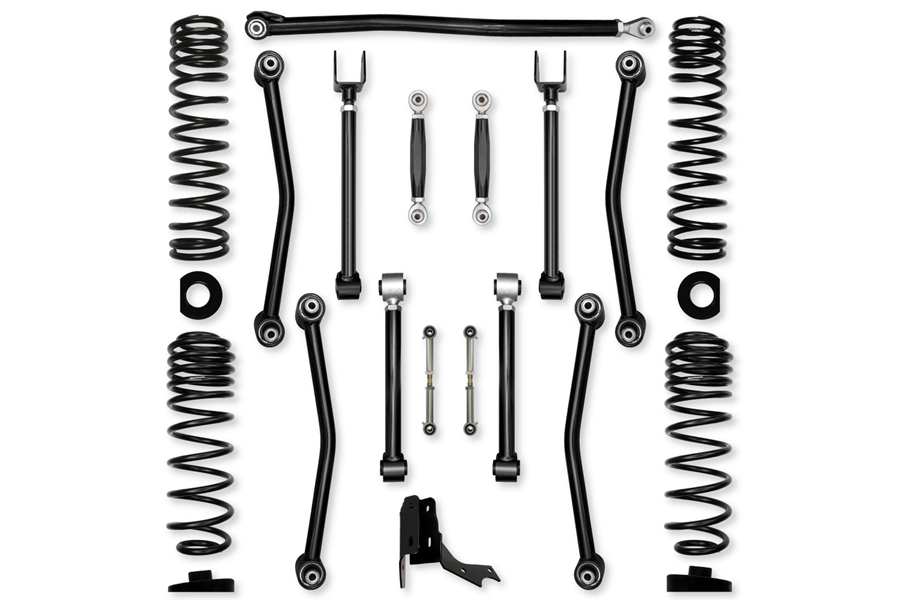 The Rock Krawler JT 3.0 Ultimate Adventure "No Limits" Mid Arm System was designed for those who want an easy bolt-in installation, excellent on-road ride and the durability and the off-road performance you expect from Rock Krawler Suspension. The "No Limits" front sway bar links allow Rubicon owners to use the factory sway bar disconnect function and still achieve maximum articulation. This kit features Rock Krawler’s proven, service free control arm joints. These joints are the industry leader in service free control arm joints using innovative technology to provide the best possible ride in your Wrangler.