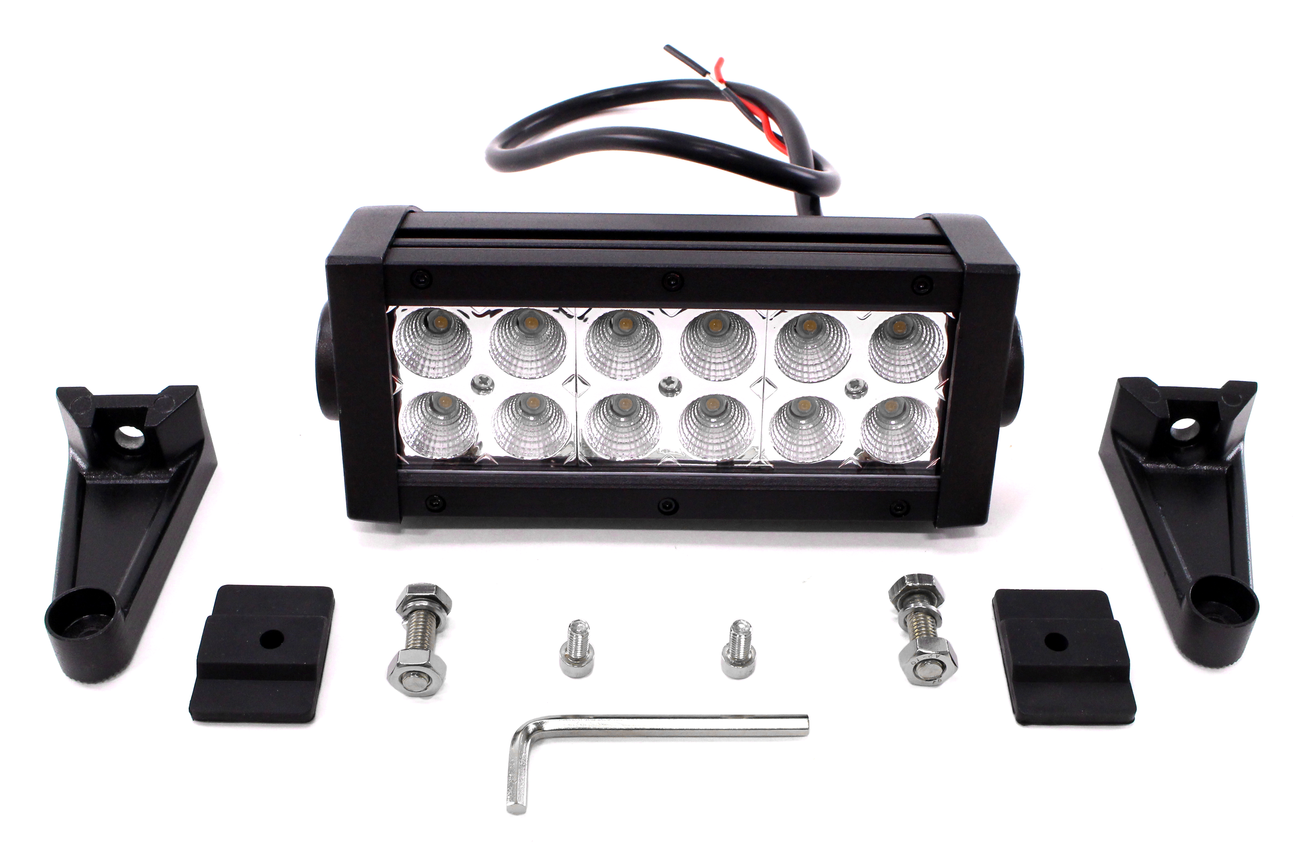 The Lifetime LED Flood Light Bar has 12 different 3 Watt bulbs for a total of 36 Watts of consistent light. Measuring 7.5inch, the LED has a draw of 2.2 A at 12 Volts and 1.2 A at 24 Volts. With 2,100 Lumens, the water proof rating is listed as IP 67. The flood bar cover is black in color and the light has an operational voltage of 10 volts to 30 volts DC. The color temperature measures 6,000 K and the housing is a die-cast aluminum material. Lenses are polycarbonate and the mounting bracket has aluminum ends.