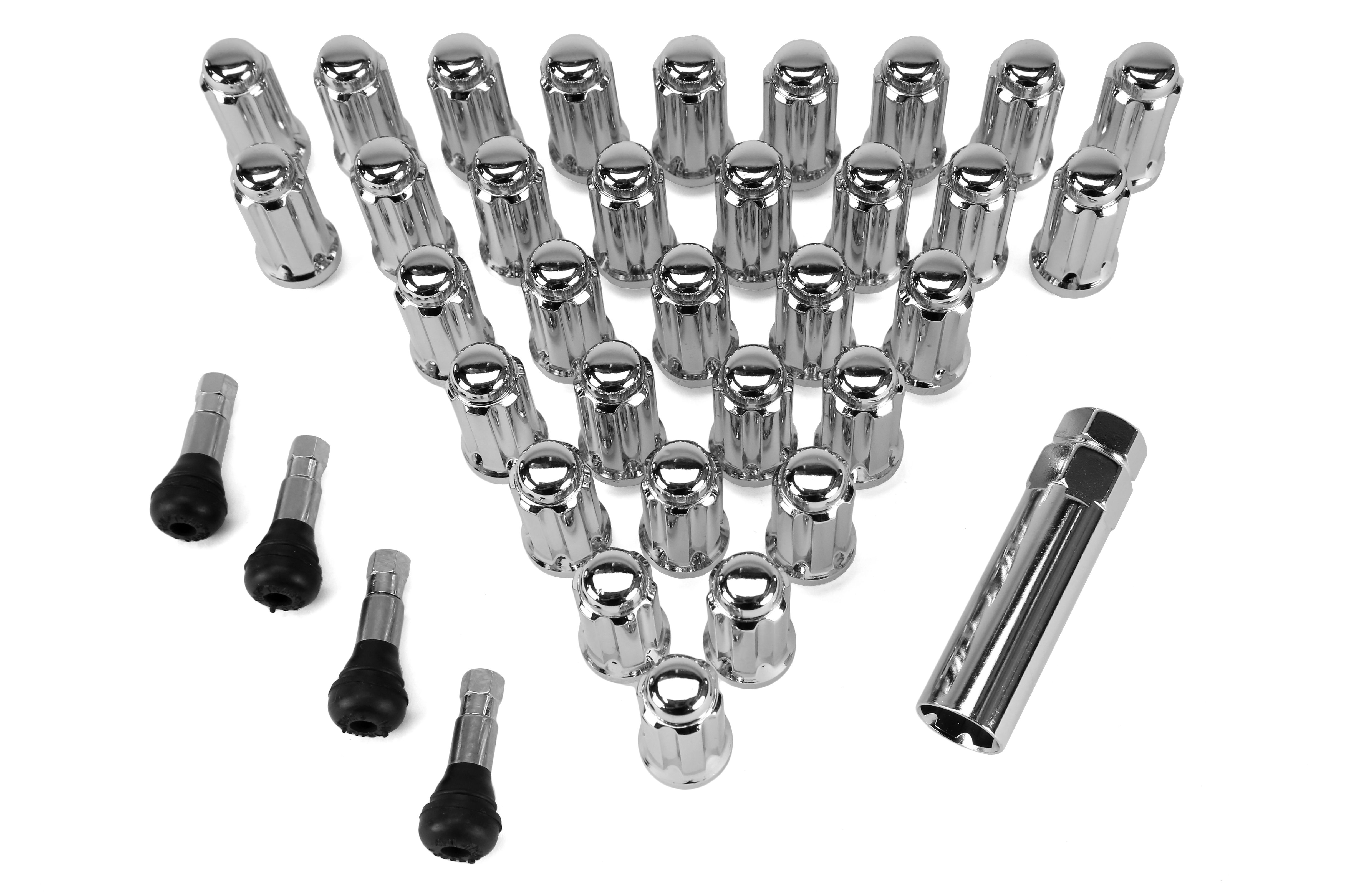Included are 32 9/16” spline truck application lug nuts, a matching lug nut socket, as well a 4 chrome valve stems.