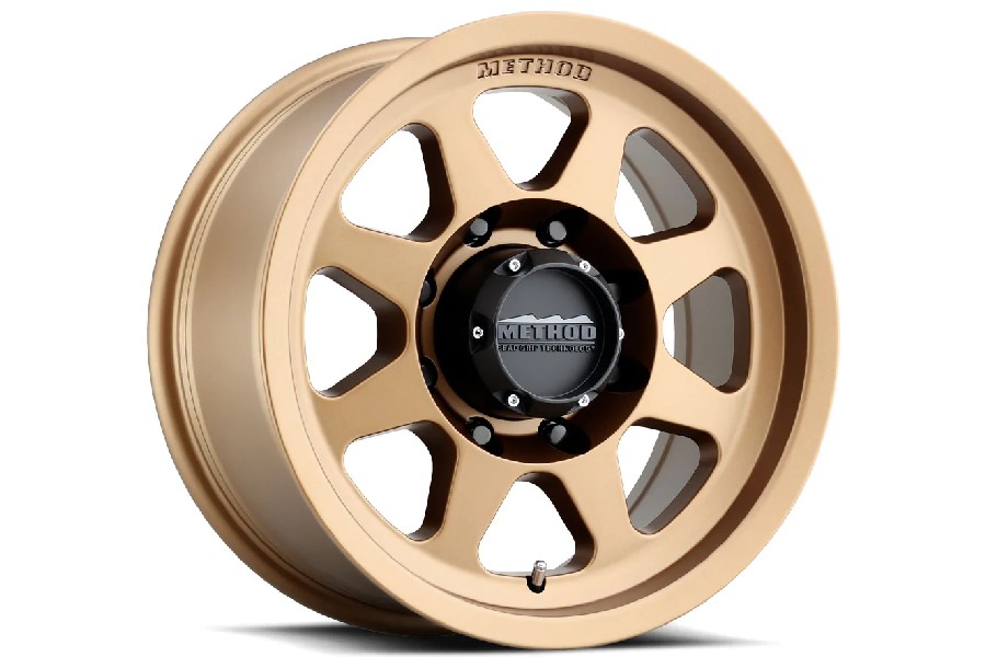 Patent-pending Bead Grip® technology engages inner and outer tire bead seat allowing lower tire pressures similar to non-street legal beadlocks - Aggressive inner 'safety hump' design taken from race wheels holds tire bead securely in place - Reinforced inner lip for maximum strength with load ratings up to 3640 lbs - Strong T6 heat treated one-piece cast 356 aluminum construction - Snap-in center cap included with 5 & 6 lug or a push through cap for 8 lug - Durable salt-spray tested Method bronze finish