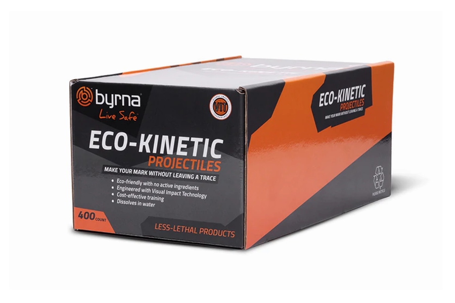 The Eco-Kinetic projectiles also feature Byrna’s proprietary VI (Visual Impact) Technology that produces a small dispersion cloud and leaves a highly visible mark where the target is hit.