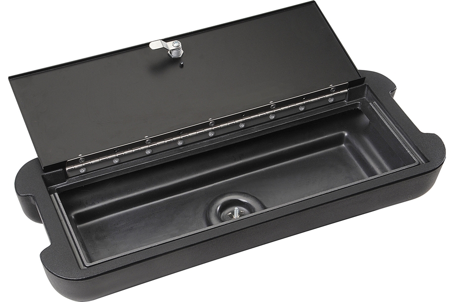 VDP's custom molded Locking Storage Vault fits that empty storage space below the rear cargo floor carpet. Keep valuables safe and secure from prying eyes and sticky fingers. This clever design provides 625 cubic inches of weather tight lockable storage. The Vault attaches to the vehicle’s floor through an existing drain hole with specialized hardware - included. There’s no drilling required! The removable wing nut locks the storage vault from inside the storage box and is quick and easy to remove without any tools. The stainless steel continuous hinge attaches the 14 gauge, powder coated steel lid to the unbreakable roto-molded box. The integrated side grip handles make it easy to lift and carry your vault. Measures 24” x 9.75” x 4.5”.