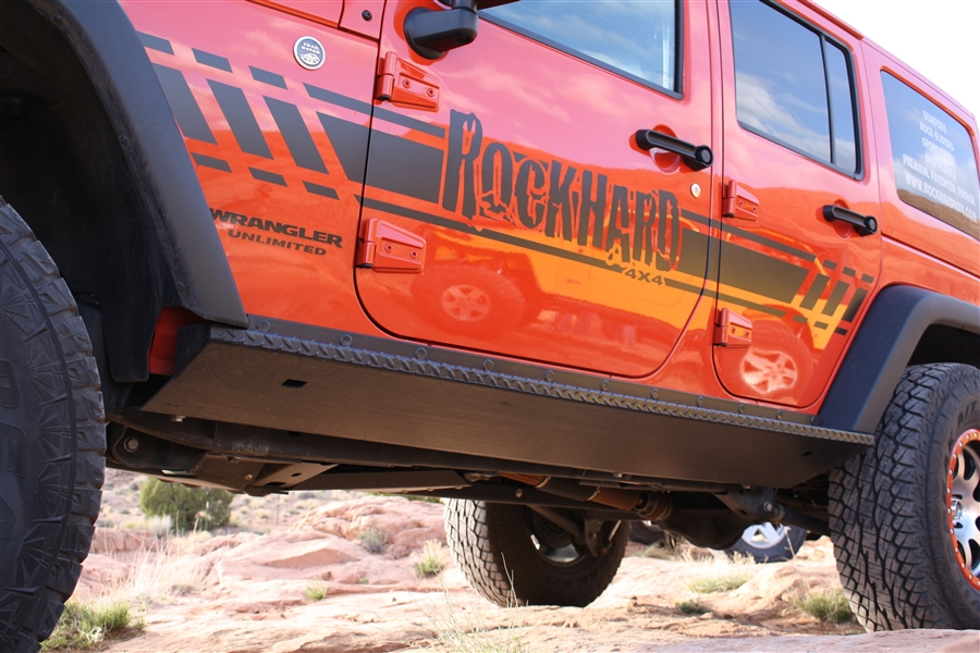 Glitz and glamor are for prettier, leaf eating rocker armor kits. This is a fully function driven Rocker Guard that maximizes your Jeep JK's rock climbing capability. By extending our extreme duty 3/16" steel plating all the way to your frame rails you now have a true "slider" that does not pin you to the obstacle. No dimples or other cute frills - just a true slider to get you up and over the rock or hybrid import car of your choice.