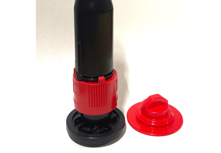 Spout kit includes: Black/red self-venting/child-proof ECO spout with rubber gasket and stopper.