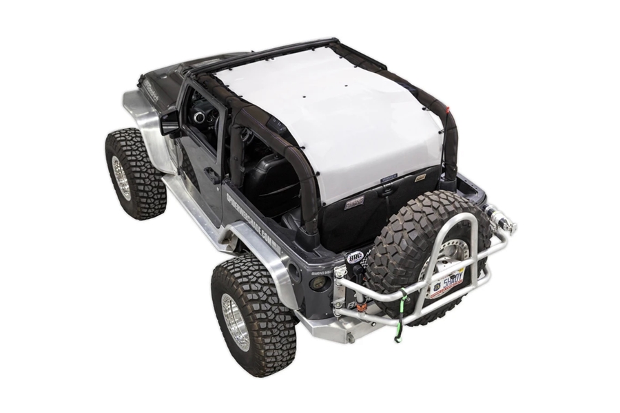 The JK2D Long is a perfect product for the summer. It is an extended version of the original JK2D providing additional shade for backseat riders and increased wind reduction for everyone in the cabin. The JK2D Long actually wraps around the rear headrests providing a very tight custom fit. This product can be paired with the JK2D Sides to create a JK2D ShadeCage. This high quality, NO-header-needed mesh top is custom and can be configured in many ways.