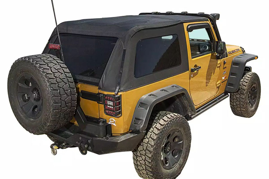 These Bowless Soft Tops also feature useful zippered mesh corner pockets for extra and convenient storage. As an added bonus, the soft top design also allows you to use more affordable aftermarket windshield headers (Rugged Ridge Windshield Header Channels recommended.) Four door configuration.