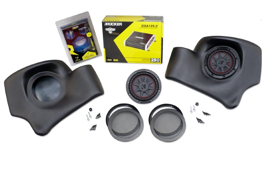Opti-Pods, mounting hardware, metal-mesh speaker grilles, Kicker 6.75” subwoofers with dual 2-ohm voice coils rated at 50 watts RMS @ 4 ohm, 2-channel amplifier rated at 30 watts RMS @ 4 ohm per channel and 8-gauge amplifier wire kit.