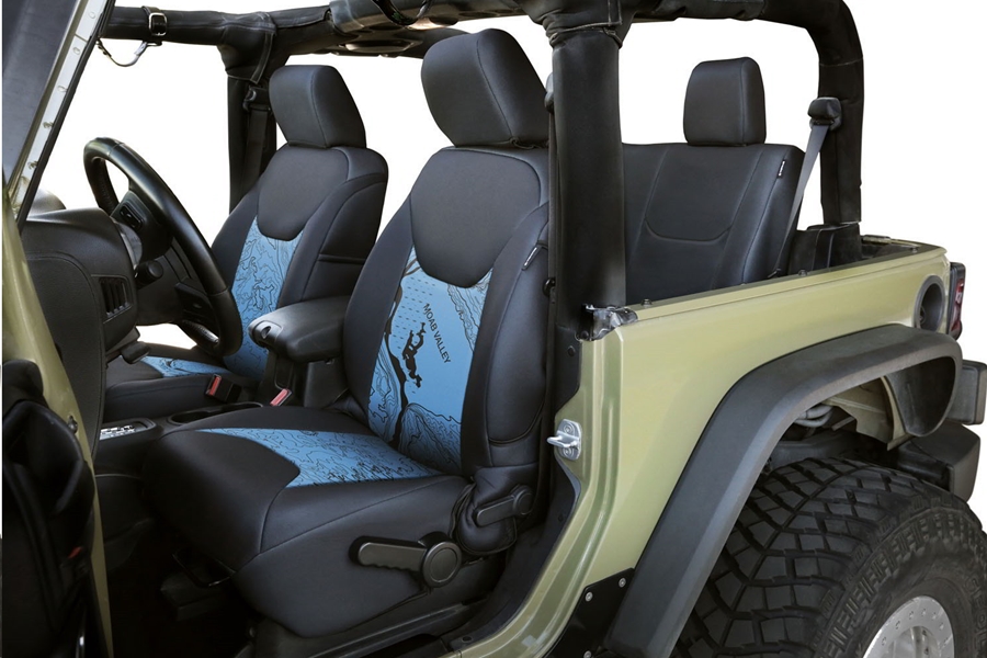 Add some flare to the interior of your vehicle with a Pair of Coverking Front Topographic Seat Covers. Transform your mundane seats with a pair of covers from Coverking who offers a slip-on product, fit perfectly for your 2 or 4 door Wrangler. Enhance the look and feel of your seats with one purchase; every order is complete with a topographic map of the Moab area and is structured with storage pockets throughout.