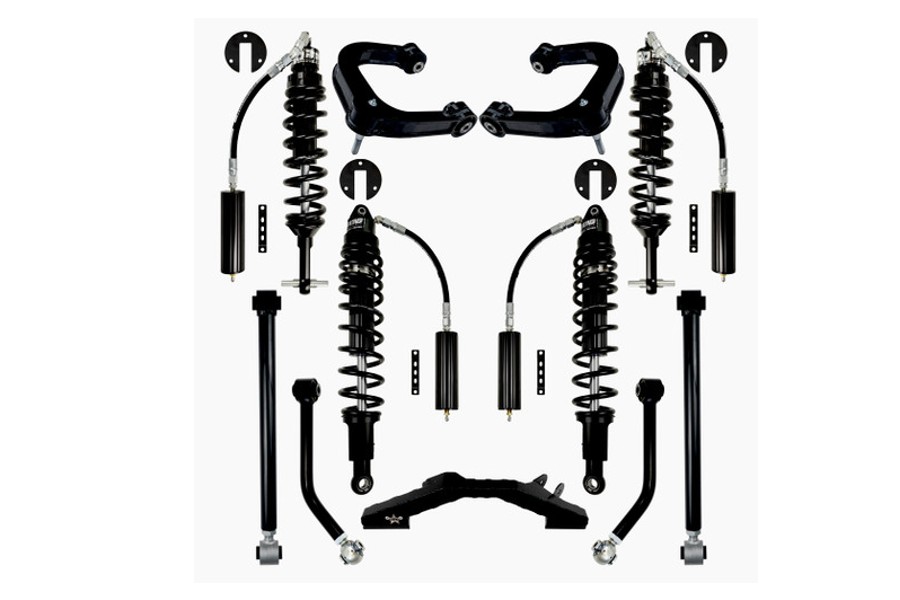 The Rock Krawler Suspension Bronco 3" Pro-X System Stage 1 is a revolutionay system for 6th Gen Bronco owners looking to increase their suspension performance by leaps and bounds with adjustable lift heights from 2"-3" making it perfect for 35" to 37" tall tires with factory fenders and replace the weak factory components with the strongest components on the market. The triangulated 4 link rear design allows for amazing articulation without suspension bind. The rear instant center and roll center are both enhanced to improve on highway ride and handling. The RRD 2.625 all aluminum remote reservoir coil overs are tuned for a incredible street ride and all out performance. Rock Krawler is the first to introduce multiple spring rates on a single spring for 6th Gen Broncos which help with ride, handling, and off-road performance on the trails and in the dirt. You will experience 30% gains in dampening capacity and wheel travel. The hard anodized aluminum bodies cool better than steel counterparts and will never rust nor corrode. The fabricated upper A arms correct caster/camber settings and account for the increases in travel. They also have free rotating, service free Adventure Series joints at the frame and a rebuildable quiet control joint at the upright. The combination of free rotation, rebuild-ability, silent operation, increased performance and overall strength cannot be beat. The rear control arms are made from solid alloy steel, have a durable black powder coat finish. Are you ready to bring your 6th Gen Bronco to the next level of tuned suspension performance? Let's Go!