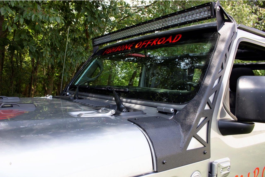 Mount your LED Light bar with Fishbone Offroad's Light Bar Bracket. The light bar bracket mounts without drilling. Make sure the LED Light bar you are mounting is 52" from end of housing to end of housing. Our light bar bracket includes a foam backing to protect the paint on your Jeep.